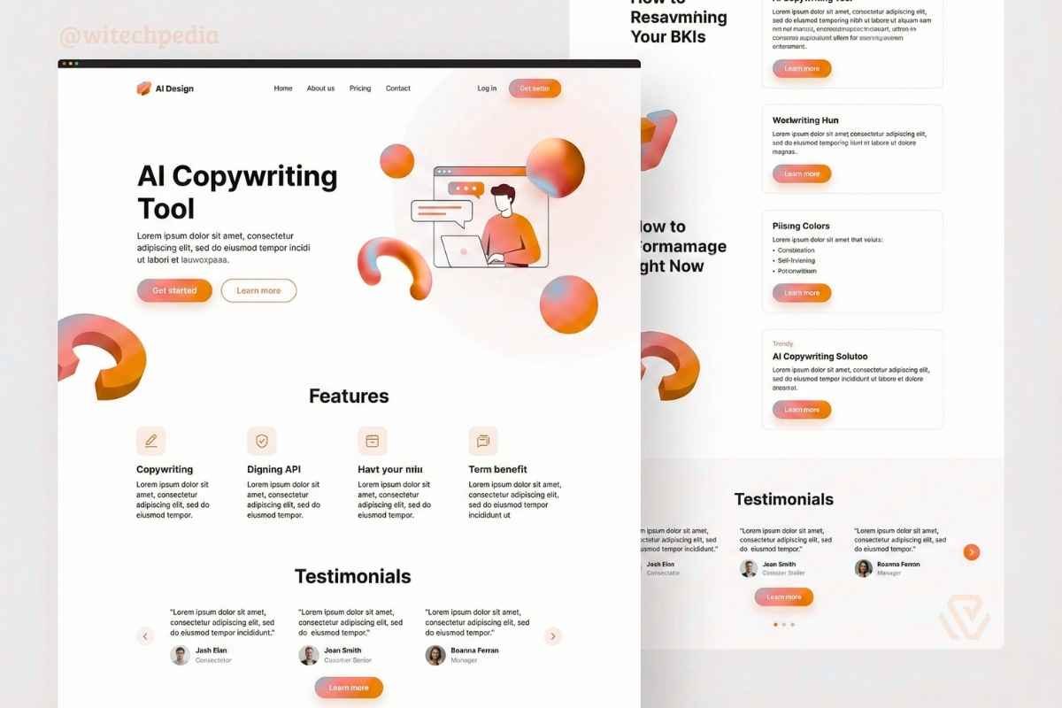 High-fidelity UI design of a SaaS landing page for an AI copywriting tool, clean white interface, floating 3D abstract shapes, purple and blue gradient buttons, modern typography, Dribbble trend, Figma style --ar 3:2