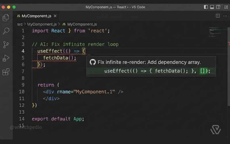 Prompt: “My React component is re-rendering infinitely. Review my useEffect dependency array. Am I creating a new object reference on every render? Suggest a fix using useMemo or useCallback. [PASTE CODE]“