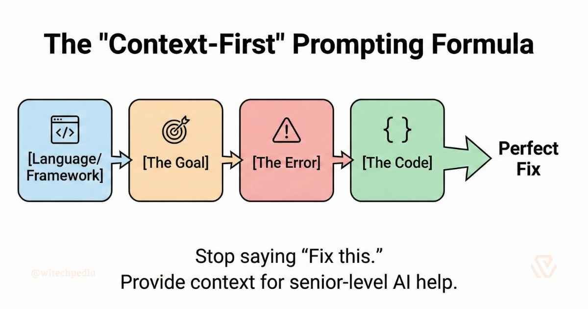 Most developers make the mistake of simply pasting their code and saying “Fix this.” To get the best prompts for debugging results, you need to provide context.